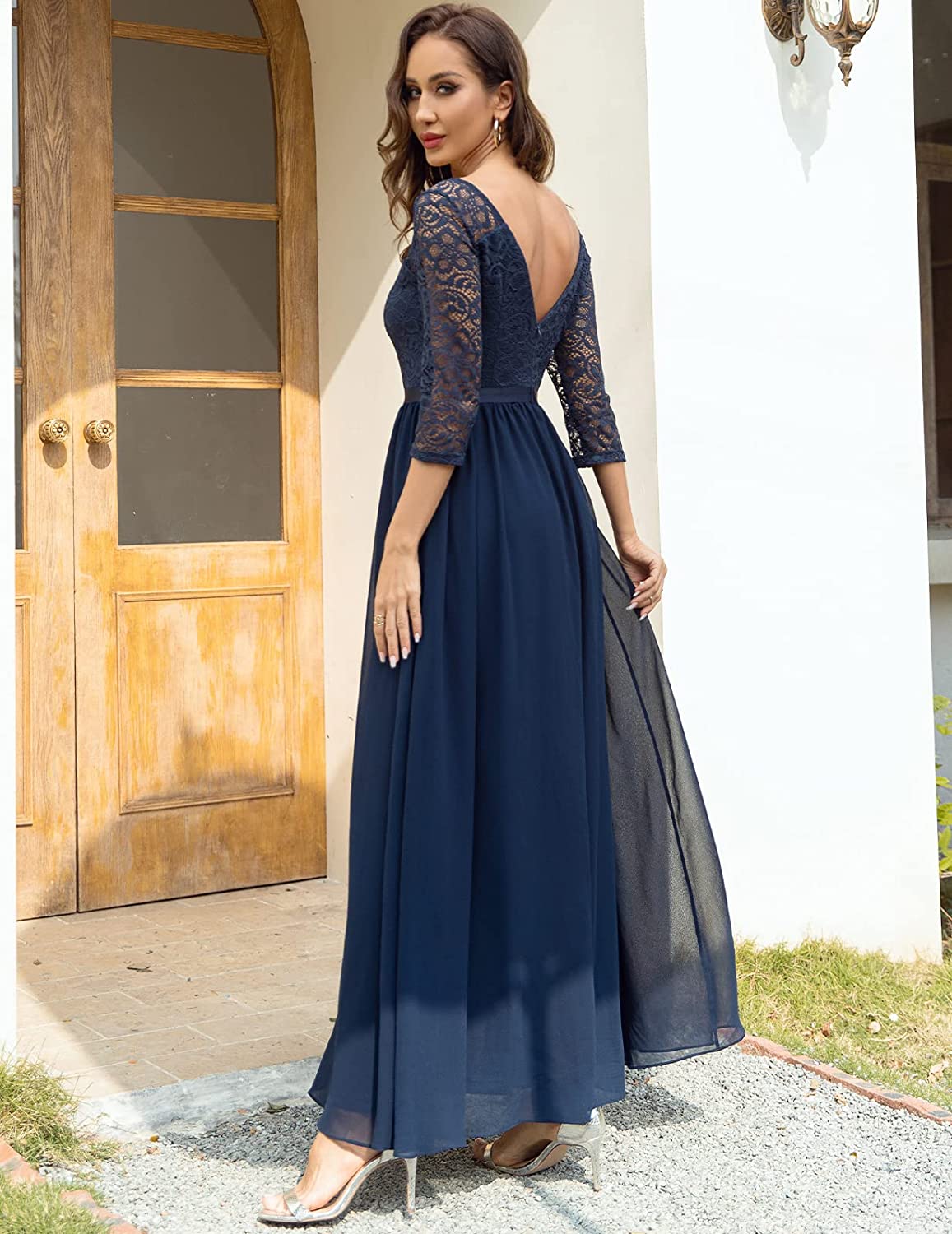DRESSTELLS Women’s Formal Lace Evening Gown Deep V Back Elegant Long Bridesmaid Dresses 3/4 Sleeves & Stretchy, Navy, Medium