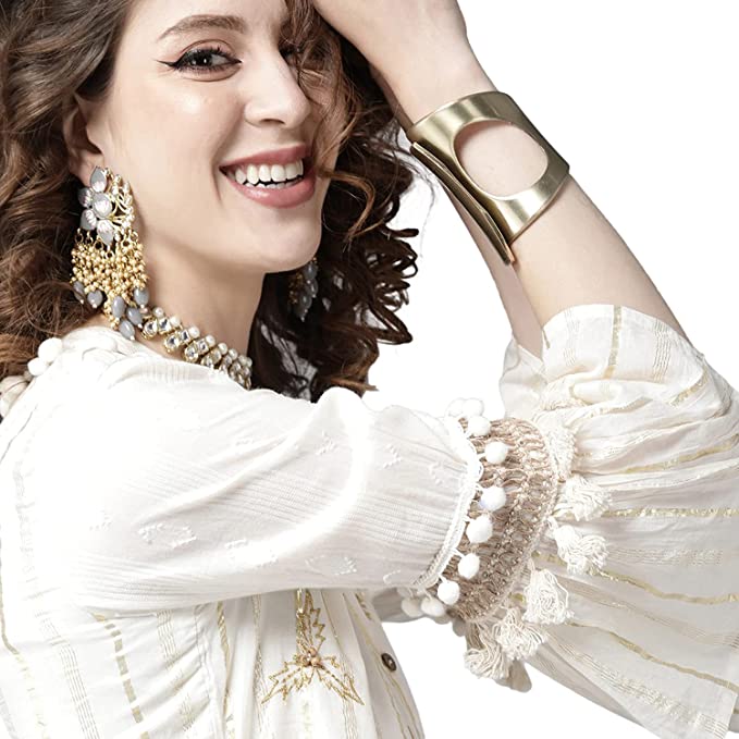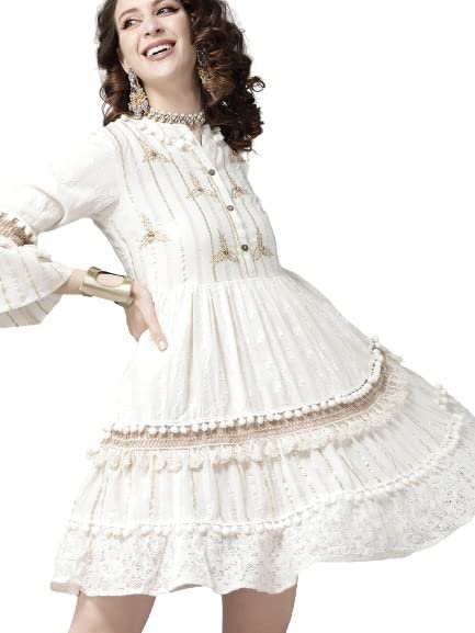 Cotton Off White Lurex Embroidered A-Line Dress, Has Mandarin Collar & Bell Sleeves, Which Is Comfortable To Wear For All Seasons.