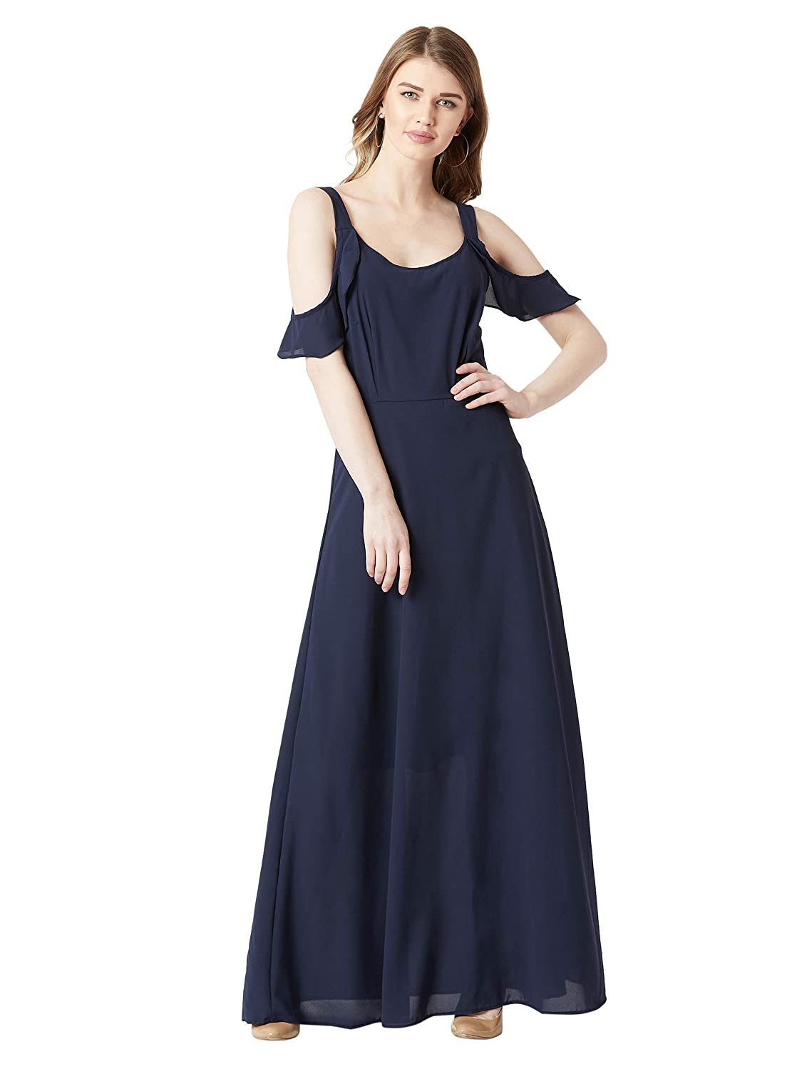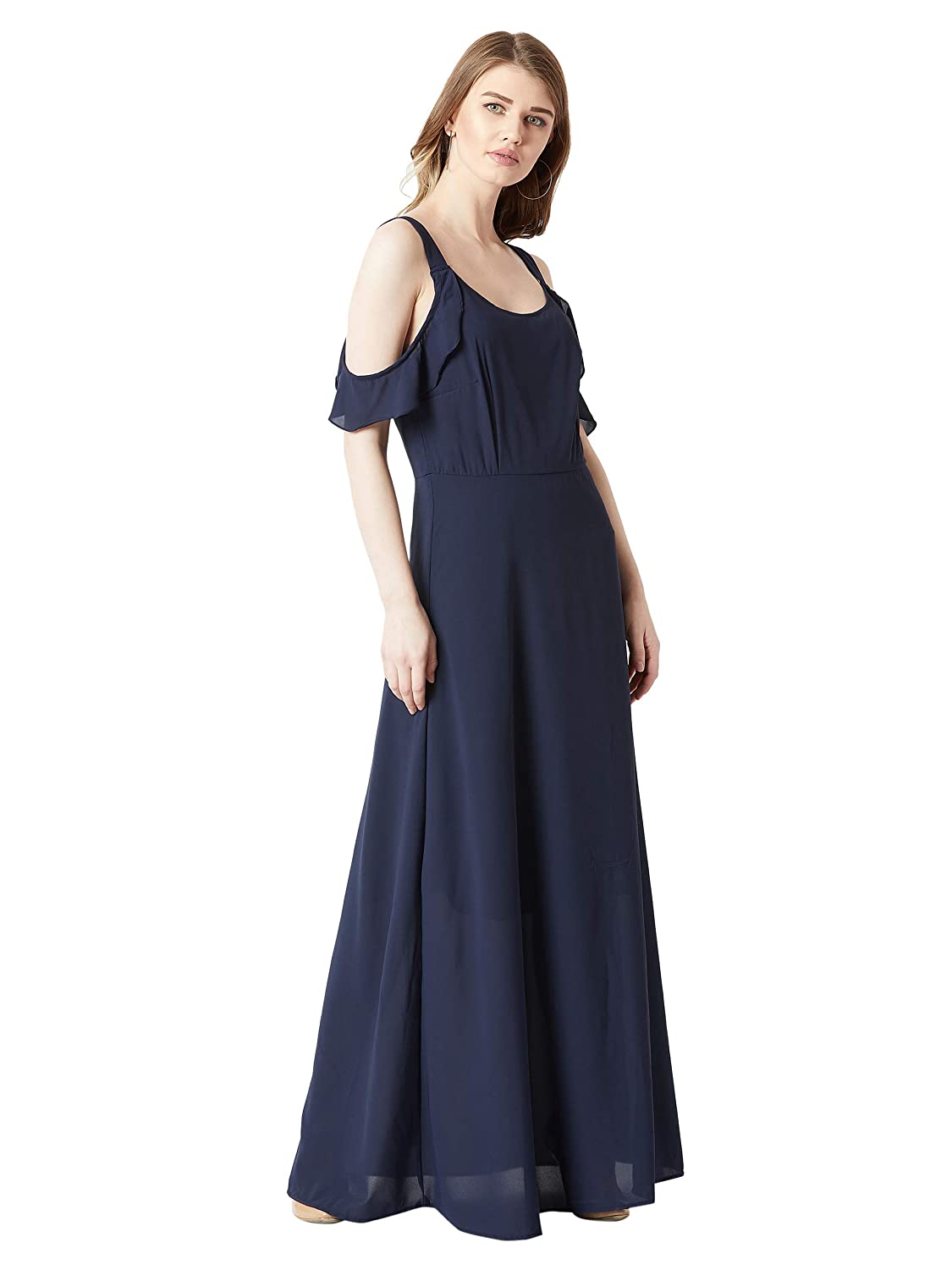 Navy blue solid ruffled flowy cold shoulder maxi dress, Has a round neck and is sleeveless, Has a zip closure