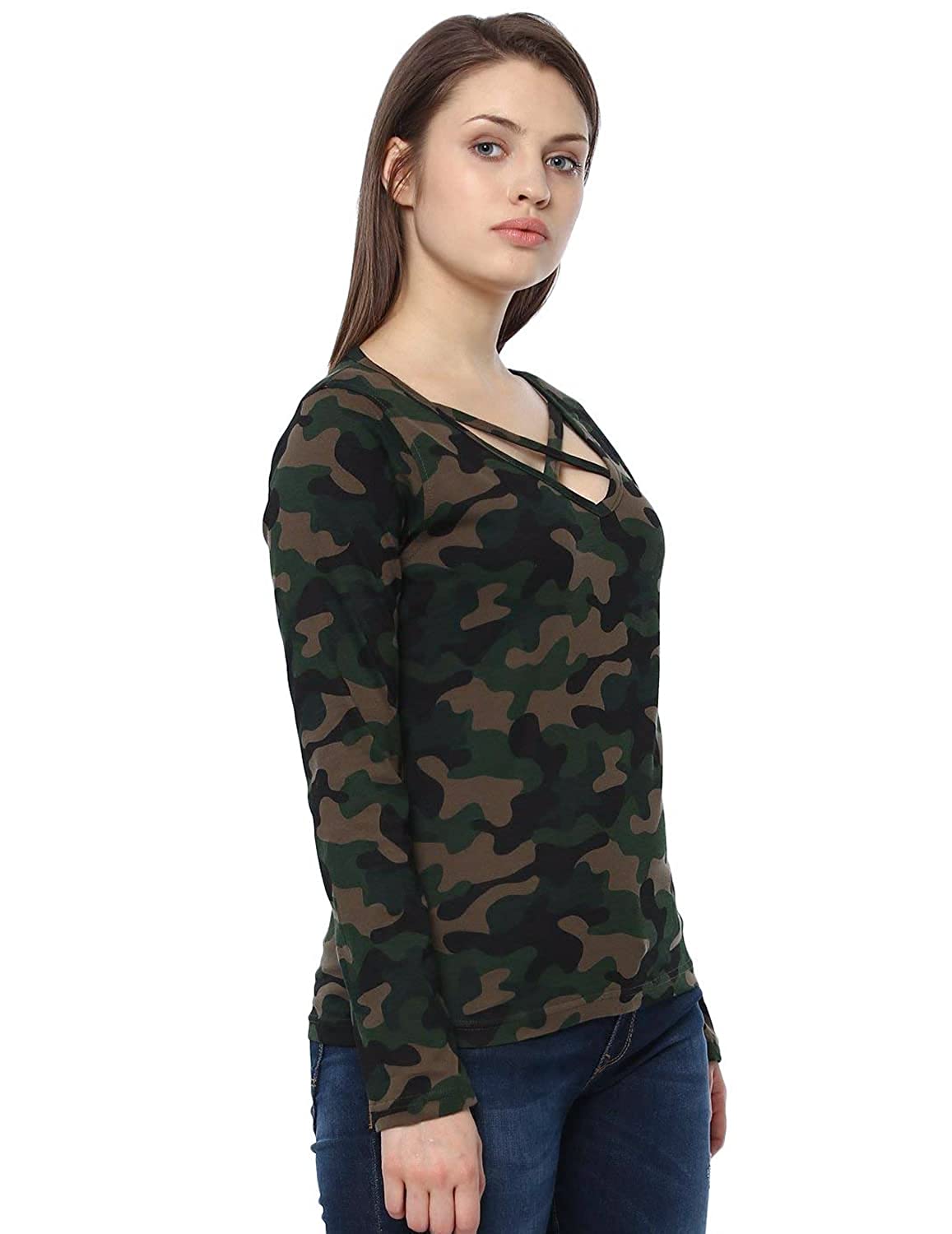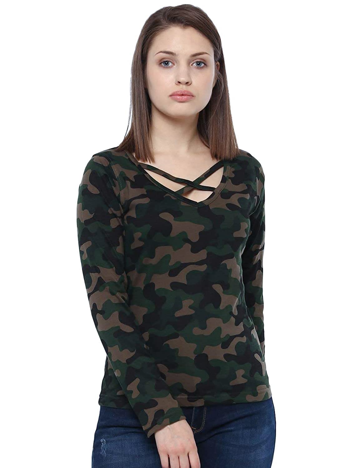 Veirdo Pure Cotton Regular Fit V Neck Full Sleeves Camoflauge T-Shirt for Women & Girls (GL_02_CAMO)